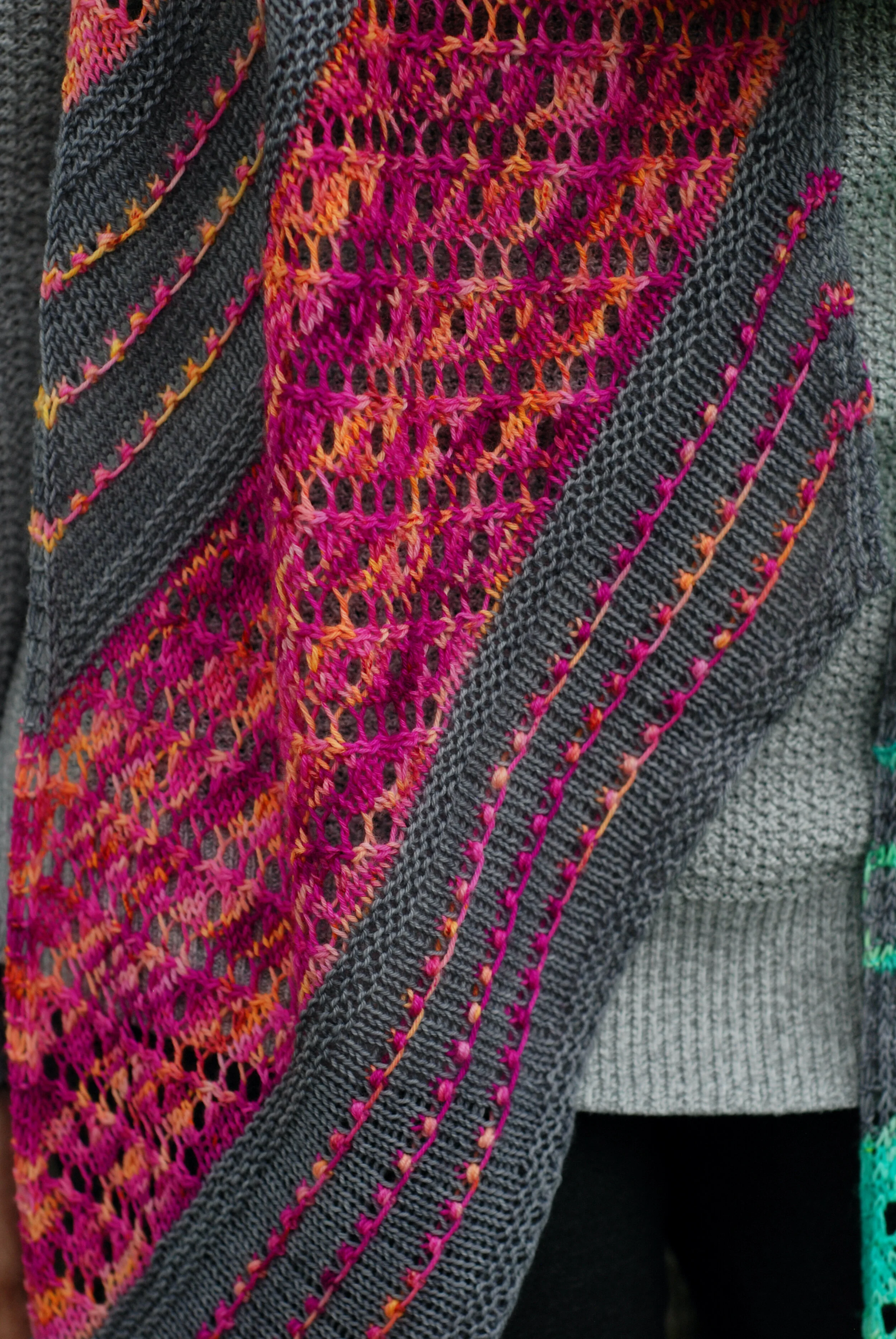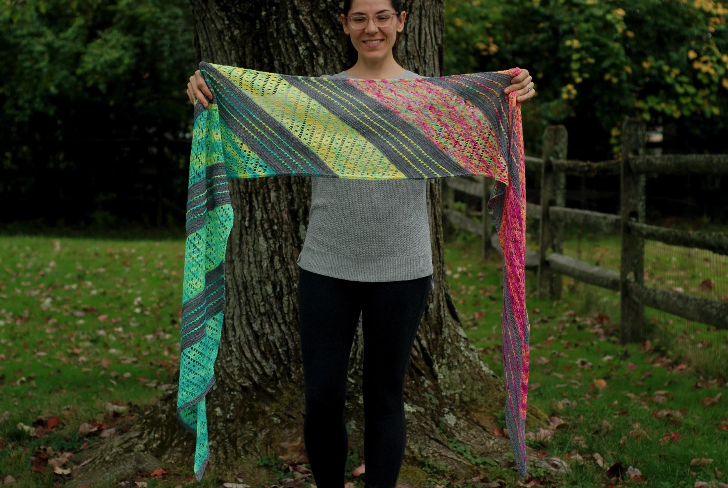 A smiling woman in a grey sweater holds out Sparklight, a knitted wrap with alternating bands of grey with neon stripes and neon lace in a teal-to-pink gradient. She stands in front of a large tree.